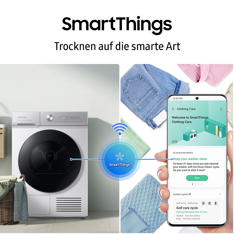 Με την εφαρμογή SmartThings, μπορείτε να ξεκινήσετε και να ελέγξετε το στεγνωτήριό σας σχεδόν από οπουδήποτε, χρησιμοποιώντας το smartphone ή το tablet σας.* Πολλές λειτουργίες είναι επίσης δυνατές μέσω φωνητικών εντολών (π.χ., Samsung Bixby, Amazon Alexa, Google Assistant).