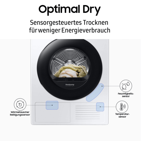 Το Optimal Dry χρησιμοποιεί τρεις αισθητήρες για να σας βοηθήσει να στεγνώσετε τα ρούχα σας απαλά και αποτελεσματικά. Οι αισθητήρες υγρασίας παρακολουθούν την ξηρότητα των ρούχων σας σε πραγματικό χρόνο και τερματίζουν το πρόγραμμα μόλις στεγνώσουν.