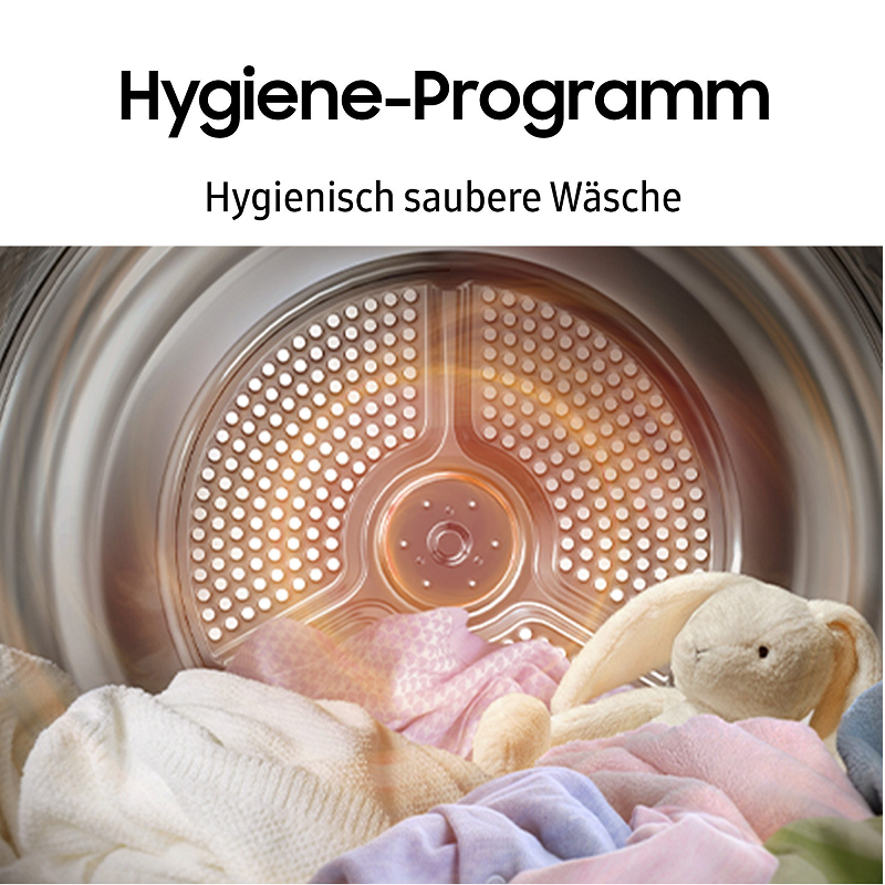 Το πρόγραμμα υγιεινής στα στεγνωτήρια με αντλία θερμότητας της Samsung προσφέρει υγιεινή καθαριότητα για τα ρούχα, τα κλινοσκεπάσματα και τα παιχνίδια των παιδιών σας, συμπεριλαμβανομένων των αγαπημένων τους λούτρινων. Χρησιμοποιεί εξαιρετικά υψηλές θερμοκρασίες για την αποτελεσματική καταπολέμηση βακτηρίων, ακάρεων και αλλεργιογόνων. Κατάλληλο για βρεγμένα και στεγνά ρούχα.